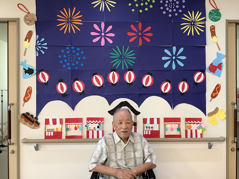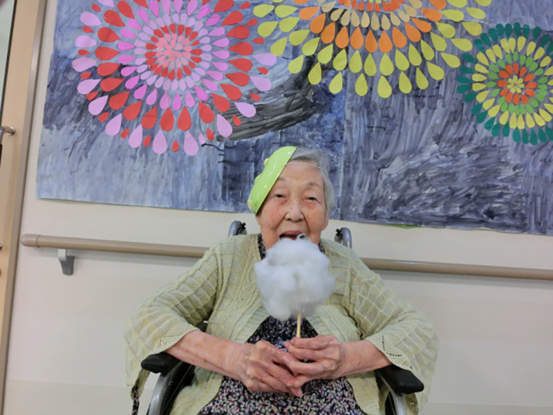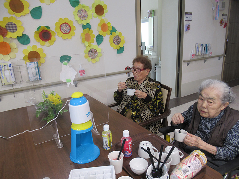 | フロアでのレクリエーションとして、かき氷と綿菓子をお召し上がりいただきました。 夏祭りで、夏と涼を感じながら楽しまれました。飾りの前で記念写真! | |