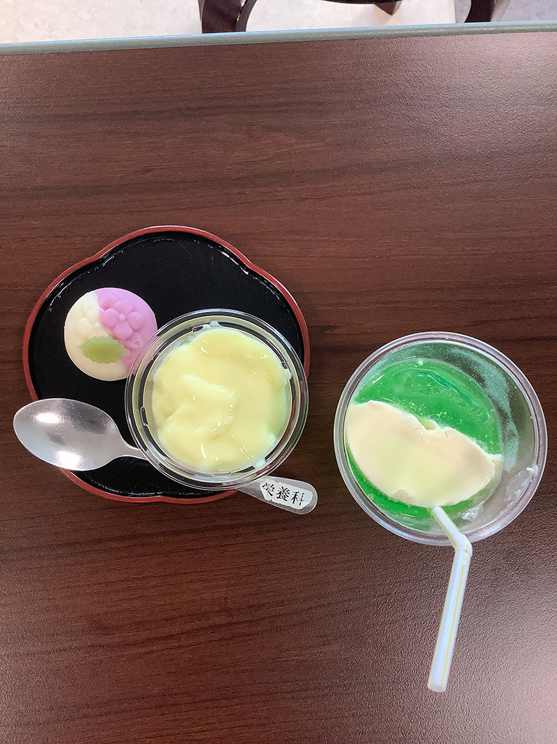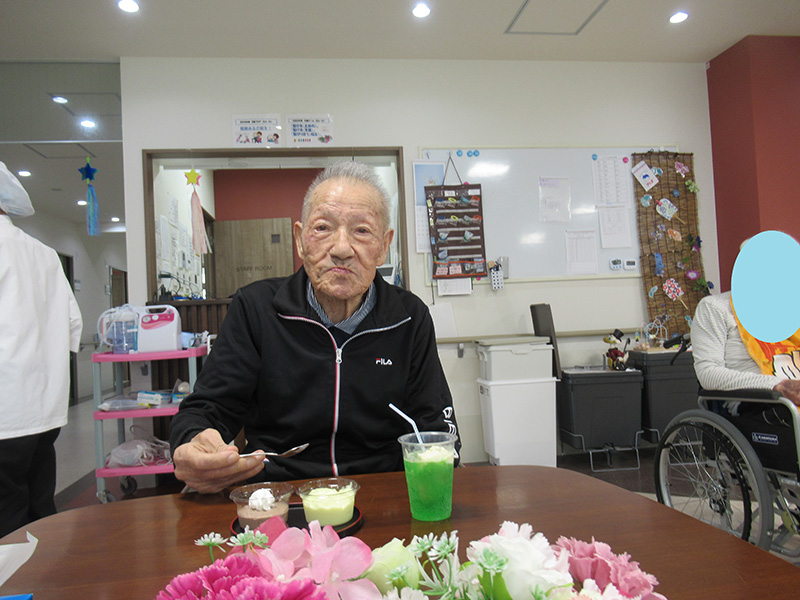 | 今月のメニューはロールケーキ、パインムース、ココアムース、花あじさいと メロンからお選びいただきました。 また、メロンソーダにバニラアイスを浮かべてクリームソーダとして 召し上がられ喜んでいただきました。 | |