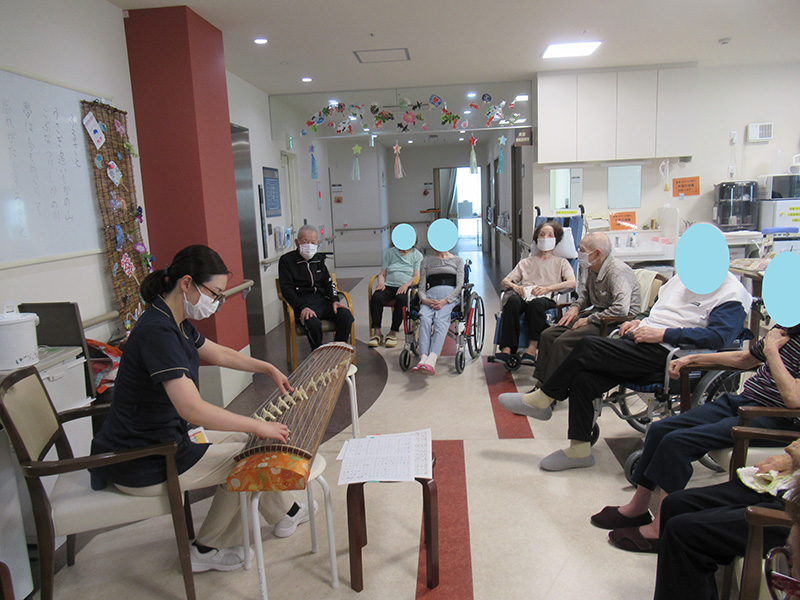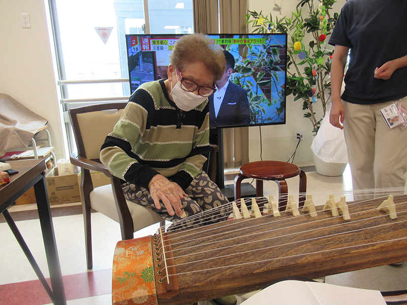 | 当施設スタッフによる琴の演奏会を開催いたしました。 やわらかな琴の音色に包まれて、ゆったりとした時を過ごされました。 その後はお一人ずつ琴に触れていただきました。 | |