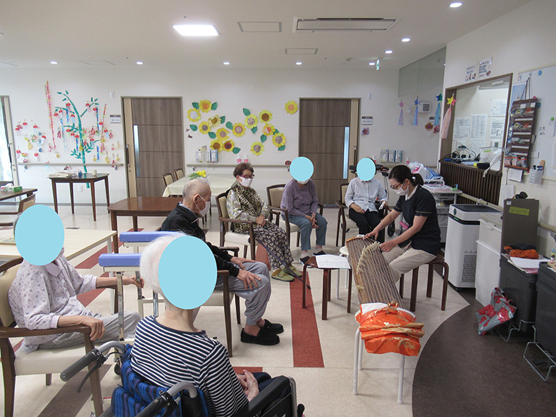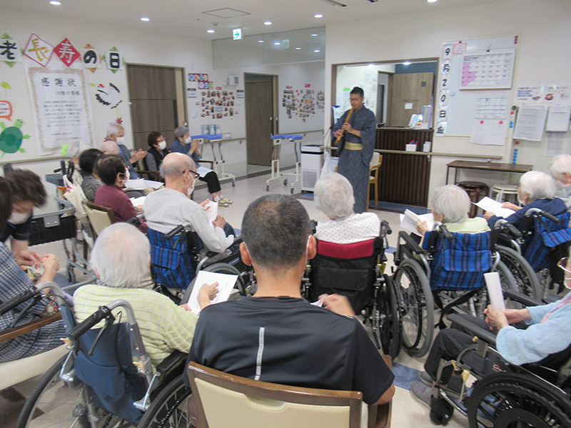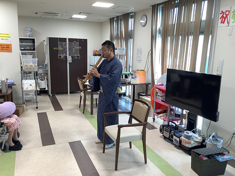 | ボランティアの方にお越しいただき、各フロアで尺八演奏会を開催。 尺八の演奏を楽しまれました。 フロアに尺八の力強い音色と、入居者様の歌声が響きました。 | |