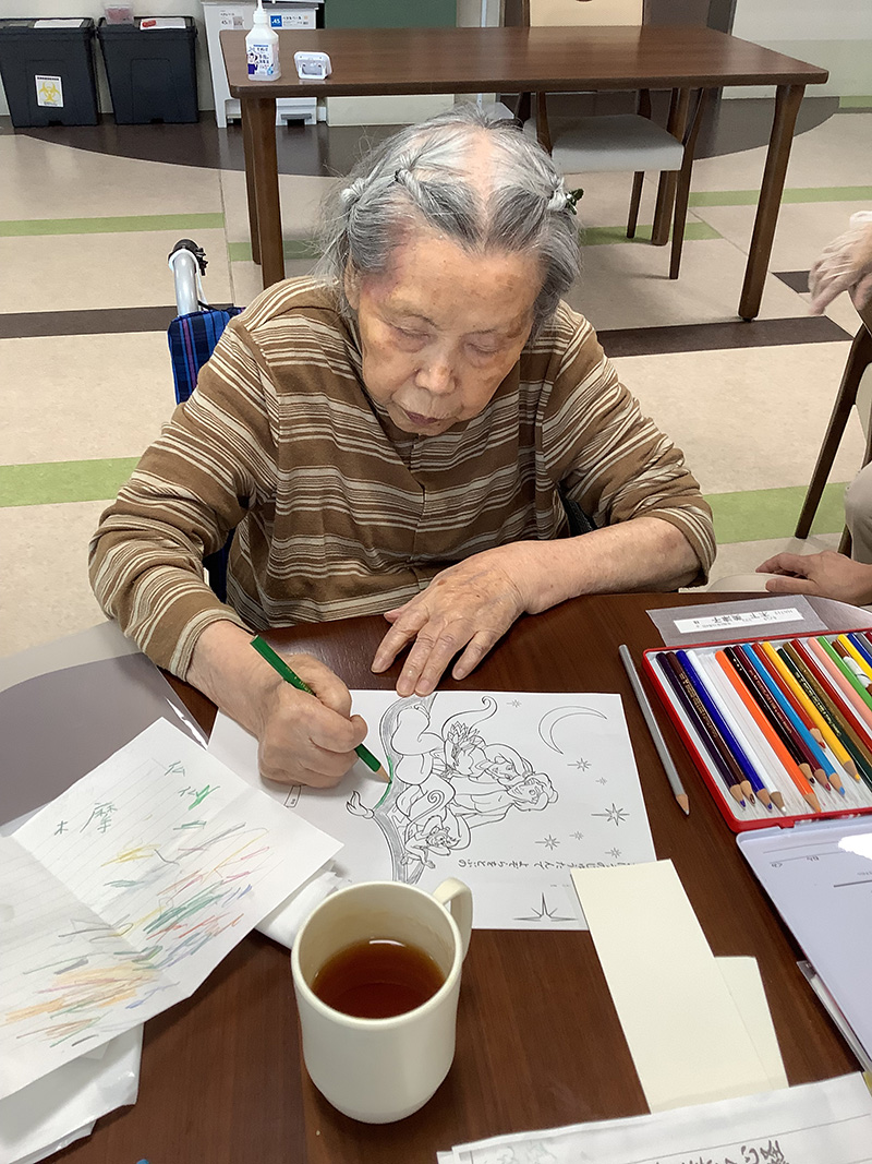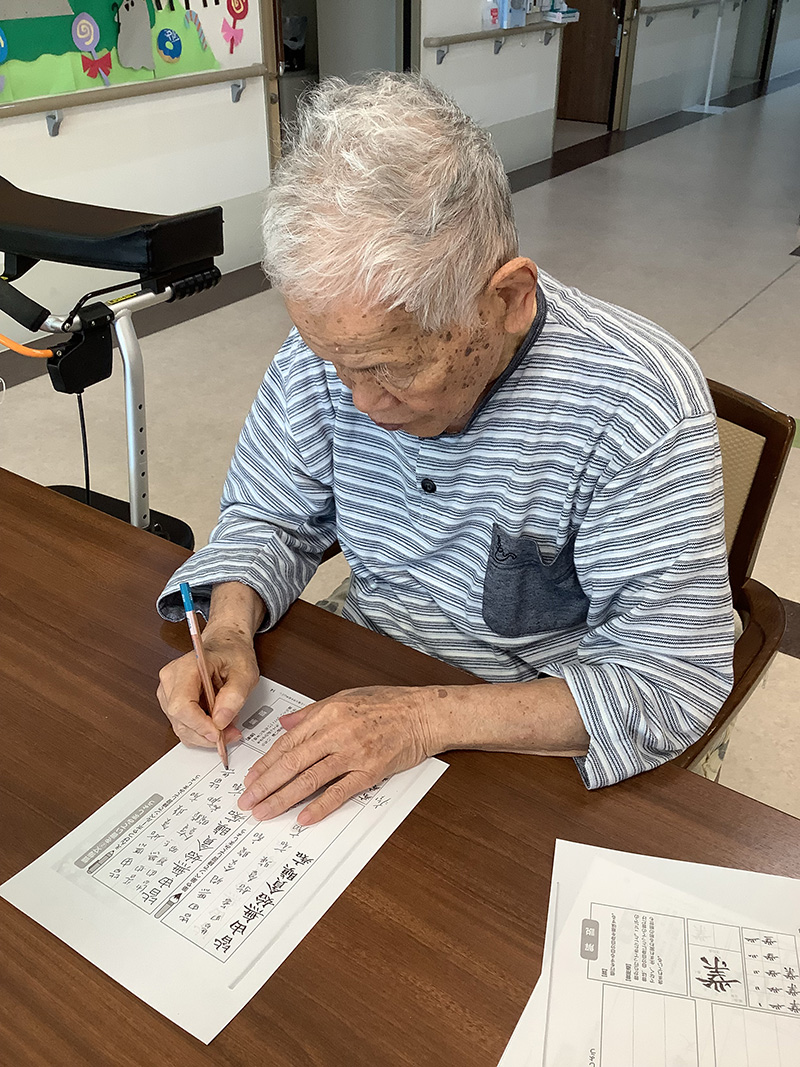| フロアではレクリエーションや、ぬり絵、漢字の書き取り、計算ドリルなどをして 過ごしていらっしゃいます。 机に向かわれると真剣な面持ちとなられます。 | |
