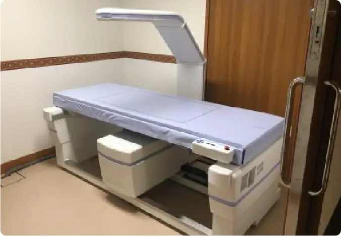 腰椎と大腿骨の2ヶ所で測定できる装置です。骨密度検査は、骨を構成しているカルシウムなどの量(骨量)を測り、骨の強度を調べる検査です。骨密度が低下すると、骨粗鬆症という骨の中がスカスカな状態になり骨折しやすくなります。腰椎や大腿骨の骨折で寝たきりにならないためにも定期的な検査をおすすめします。