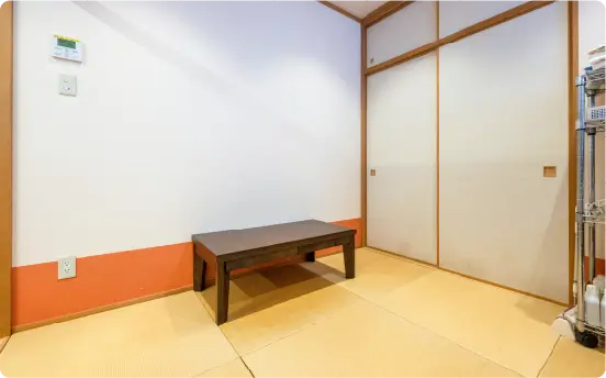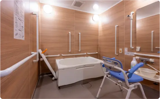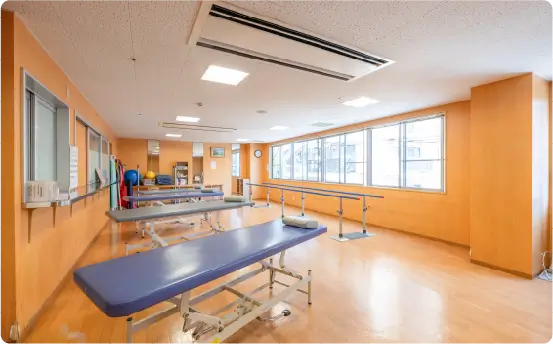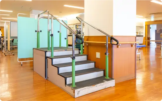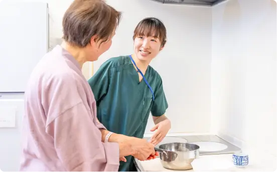 リハビリテーション室での動作練習だけでなく、実際の病棟生活の中での練習・指導も行っています。浴室やダイニングキッチン、和室といったご自宅に近い環境で動作練習を行うための設備や、福祉用具・自助具も備えています。