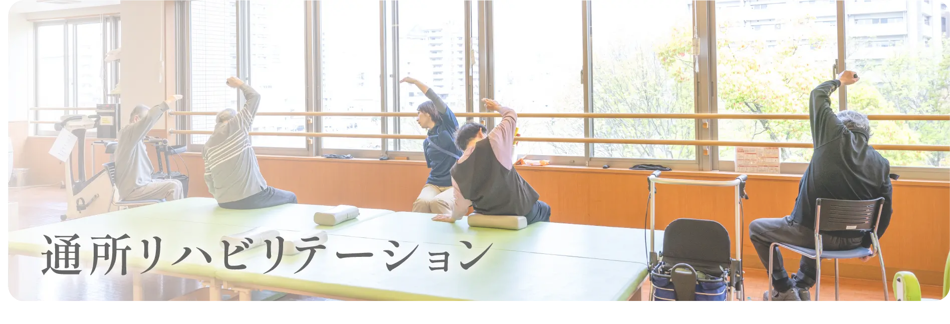通所リハビリは、介護保険でご利用頂ける送迎付きのリハビリです。自立支援・重度化防止を目的とし、理学療法士、作業療法士等、リハビリ専門職による個別リハビリの他、集団体操、マシントレーニング、物理療法等、個々の身体機能に応じたプログラムを提供しています。病院に併設しているため、安心してご利用頂けます。