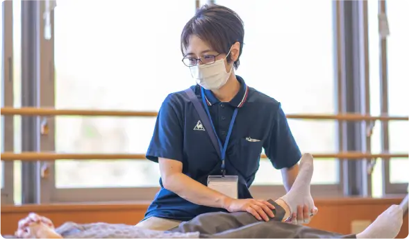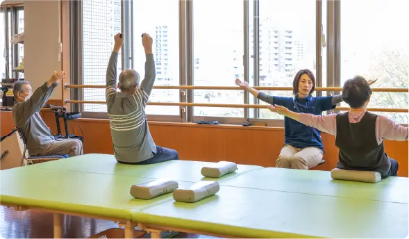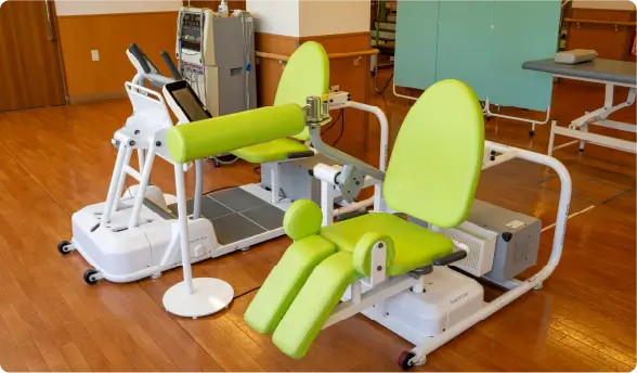 マシントレーニングによる機能訓練、机上課題による認知機能の刺激、痛みに対して温熱療法(ホットパック)等を行います。